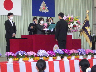 新型コロナウイルスの関係で式場には卒業生と保護者2名、関係職員の参加となり、在校生は教室にてモニターで卒業を祝う形となりました。