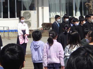 卒業式後は、校庭に集合し在校生とのお別れの会を行いました。制限のある中ではありますが、心温まる時間を過ごすことができました。