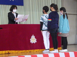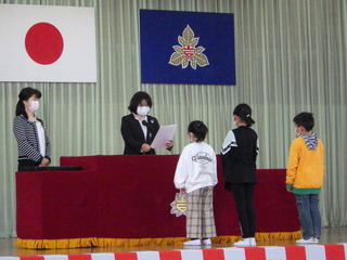 1年生、5年生の代表児童が1年を振り返っての作文を発表した後、各学級の代表の児童に修了証書を渡しました。
