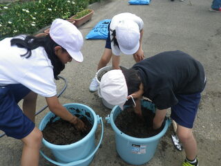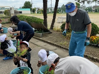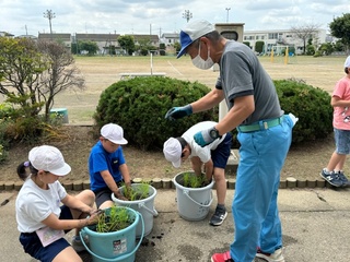 今年も学校応援団の方々にご指導いただき、バケツ稲づくりを行いました。初めて稲の苗を見た子供達もいました。私たちがいつも食べているご飯が、この稲から作られるということに驚いている様子でした。これから、水をあげたり稲の生長を観察したりしていきます。