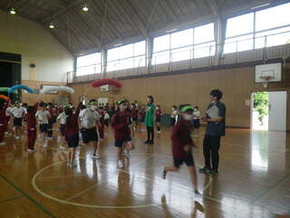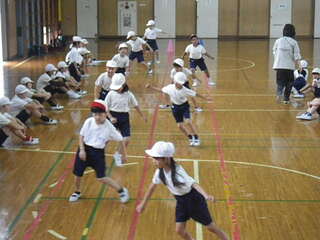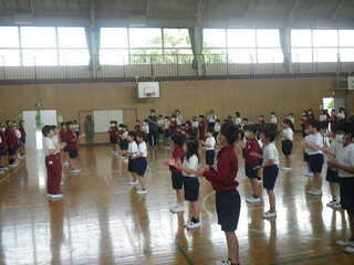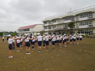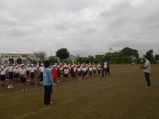はつらつタイムでは、マラソンや道具を使った運動を行い、体力づくりをしています。今日は、学校応援団の方に整備をしていただいた、校庭ではつらつタイムを行いました。6年生の素早い動きを見習って、下級生も列を整えようと頑張っています。