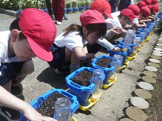 1年生は朝顔のたねをまき、2年生はミニトマトの苗を植えました。大きくなりますようにと、願いをこめてたねをまく姿が見られました。2年生は、ミニトマトの苗を観察し、葉っぱはトマトの匂いがすることに気付きました。