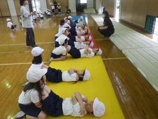 現在の自分の体力・運動能力がどのくらいあるのか確認するためのテストを行いました。今日は、反復横跳び、立ち幅跳び、長座体前屈、上体起こし、ボール投げ、50m走を行いました。1・6年、2・5年でペアを組んで、励まし合いながら計測をしました。結果をもとに、今年一年、様々な運動をして体力をつけていきます。
