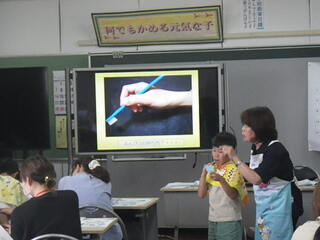 1年生が歯科衛生士の方を講師に迎え、親子で歯の磨き方を学びました。歯ブラシのどの部分で磨くとよいのか、歯によって違うことがわかりました。また、歯の染め出しをしたことで、磨き残しがちな歯も見つかりました。子供達はさっそくその日の給食後から、手鏡をよく見て、気を付けながら磨いていました。