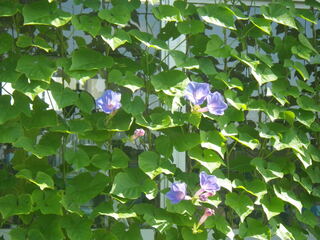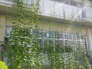 8月、琉球朝顔によるグリーンカーテンが出来上がってきました。琉球朝顔は、花が3つ以上集まって咲いています。1年生の皆さんの朝顔は、どれくらい成長したでしょうか。学校にある稲も元気に上へと伸び、稲の身長は65cmになりました。稲の赤ちゃん(幼穂)ができていないか観察をしてみましたがまだありません。3年生の皆さんの稲の様子はどうでしょうか。