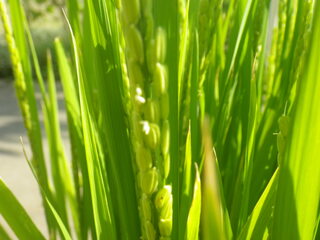 学校にある稲は、80cmの高さまで伸びました。茎の中で穂がだんだん大きくなり、花が咲きました。いつも食べているお米は、この後どのようにしてできるのか楽しみです。