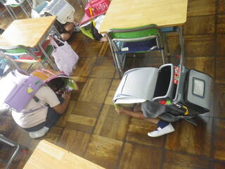 今日は、地震から火災が起きたときの避難訓練を消防署の方にも来ていただいて実施しました。火災が起きたときは、けむりを吸ったり目に入らないようにしたりし、体を低くして移動することが大切であることを学びました。また、登下校中に地震が起きた際、いつも背負っているランドセルを使って頭を守る方法も実践しました。