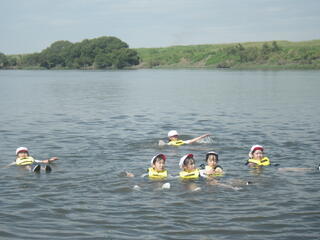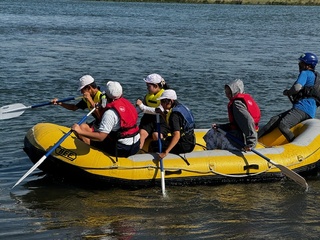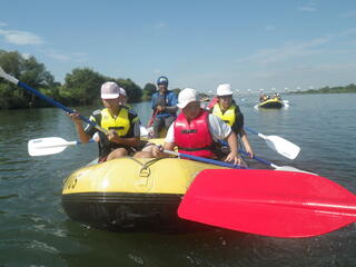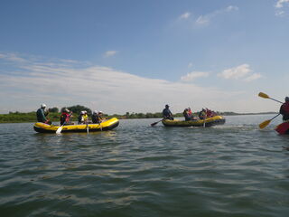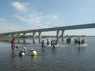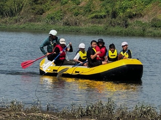 利根川の水面上から、利根川の美しさや自然環境に直に触れる利根川ラフティングツアーを実施しました。川のつくりや水辺の安全対策も確認しつつ、児童は1・2と号令をかけながらボートを漕いでいました。利根川の流れの速さや深さを体感し、川に生息する魚や鳥などを見ることができました。