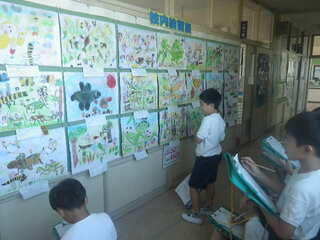 校内絵画展が24日から25日に行われました。子供達は、校庭の虫と遊んでいるところや学校の中のお気に入りの場所を描くなど、一人一人が思いを込めて描きました。作品が展示されると、他学年の絵を鑑賞し、素敵なところを発見していました。