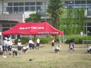 運動会に備えて、朝の時間に、校庭整備を全校児童で行いました。自分達が安全に運動できるように、石を拾ったり、草を取ったりしました。運動会練習も始まり、校庭には日除けためにテントを張りました。毎日しっかり食べて睡眠をとり体調を整え、運動会本番を迎えたいと思います。