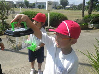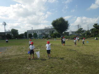 川俣小学校の校庭には、たくさんの昆虫がいます。今日は1年生が、虫を観察し虫と遊んでいる絵を描くため、虫捕りを行いました。ぴょんぴょん跳ぶバッタを追いかけたり、朝顔で一休みするカマキリを見たりしました。