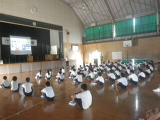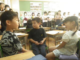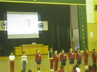 今年度から、デジタル教科書を使った音読学習を行っています。今日は、5年生が、古典や「われは草なり」を群読しました。言葉の意味を考えながら抑揚をつけ表現する姿に、他の学年の児童も集中して聞き入っていました。