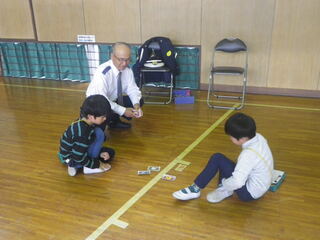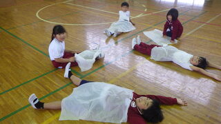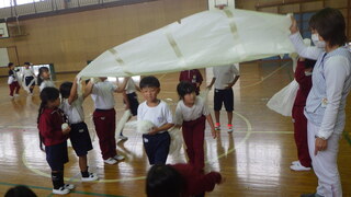 1年生が、図工の学習で大きな紙を使って遊びを考えました。体全体を使って、紙で遊ぶことを楽しんでいました。どんな遊びをしたのか紹介もしました。