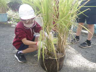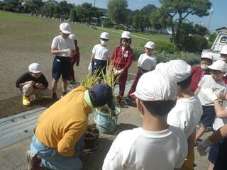 3年生が、暑い夏休みの間も水やりをして育てたバケツ稲の稲を刈りました。稲刈り用の鎌を右手に持ち、左手に稲をつかんで、斜め上に向かって切ります。稲の根は、バケツいっぱいに広がっていました。