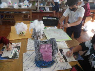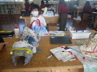 4年生が、形から想像して作品を作り上げています。プラスチック容器などで型を作り、そこへどろどろした液体粘土を染み込ませた布をかぶせて固め、色を塗ったり飾りつけをしたりしていました。