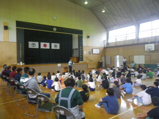 カンジヤマ・マイムによる「おしゃべりなパントマイム」の学校巡回公演が行われました。「人間の体は、皆さんが思っている以上にいろんなことができるんですよ。」子供達は想像力をたくさん使って、いろいろな人やもの、場所を目の前に描き、大いに楽しみました。