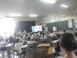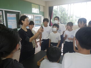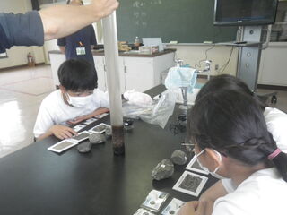 6年生が、埼玉県立自然の博物館の方をお招きして、地層について学習しました。実際に埼玉県の地層から出てきた化石を見たり触ったりしました。また、岩石をルーペで観察して種類を見分けていました。