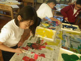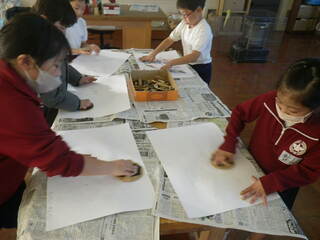3年生が、凸凹のある身近な材料を台紙に貼って「でこぼこさん」を作りました。「でこぼこさん」にいろいろな色のインクを着けて紙に写す紙版画をしました。どんな作品になるのか楽しみです。