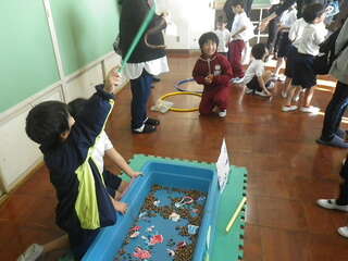 1年生が「あきまつり」の遊びに、川俣小のみなさんを昼休みに招待しました。1年生は、2年生から6年生そして先生方も招待し、こま回しや的当てなど手作りのおもちゃで楽しませてくれました。