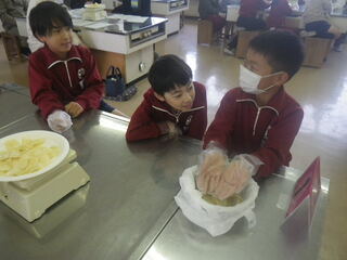 3・4年生が、カルビー講師におやつの必要性や栄養の摂り方について教えていただきました。おやつの最適な量は、一日のエネルギー量10分の1程度で、ポテトチップスで言うと35gだそうです。両手の平にのるくらいということで、子供達はいつも食べている量と比べていました。