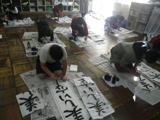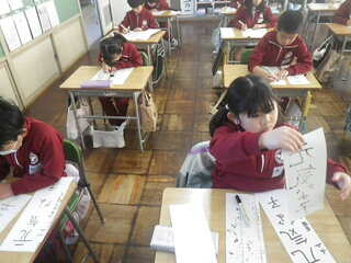 1・2年生はペンで、3~6年生は、だるま筆で一画一画を丁寧に書きました。平仮名はやわらかくカーブを書くのが難しく、漢字は画数が多いのでバランスが難しかったです。