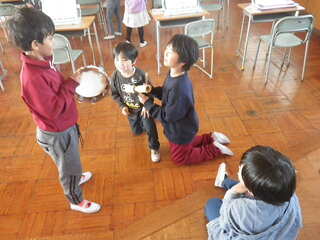楽器の音を聞いて、どんな感じがする音か考えました。演奏してみたい楽器を選んで、子供達はグループになり、音の響きからイメージして音楽をつくりました。