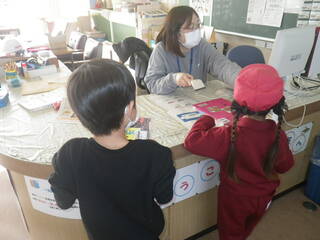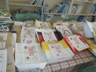 学校の図書室には、新しい本が入り、冬休み用の本を借りに子供達が集まっています。冬休みは2冊借りることができます。そして、3学期の貸出イベントの新春福袋の準備をしています。どんな本が入っているかは、お楽しみ。