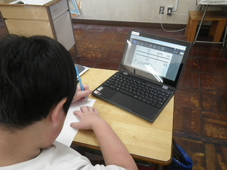 5年生が、普段の生活で見かける「20%びき」という割合の計算の仕方について学習しました。タブレットを使って計算の仕方をまとめ、答えの求め方は一つだけでなく他にも方法はないかもっと考えていきたいと感想を述べていました。