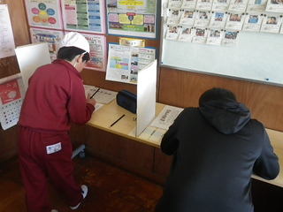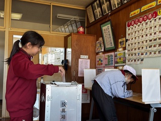 本物の投票箱を用いて、川俣小レコードのグランプリを決める投票を行っています。成人したら行う選挙の投票もこんなふうにやるのかなと緊張しながら、投票していました。