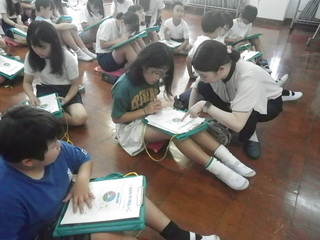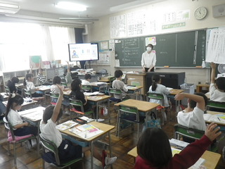 4年生が講師をお招きし、手話体験をしました。自己紹介ができるように簡単なあいさつや自分の名前を手話で表す方法を教えていただきました。手話は、耳の聞こえない人とのコミュニケーションの道具であることを学び、自分にできることは何だろうと考えるきっかけとなりました。