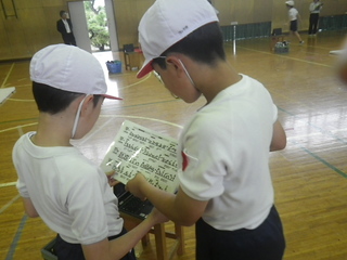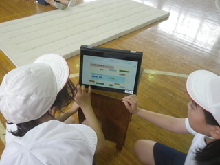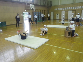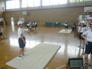 5年生が、自分のめあてを達成するため技を練習してきました。今日は、習得した技を組み合わせ、発表に向けて練習しています。グループの友達と技の組み合わせ方や技のよいところについて伝え合いました。