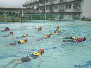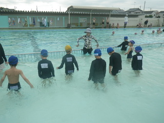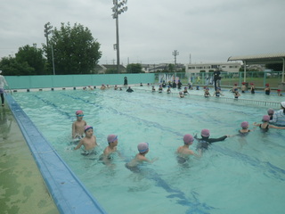 待ちに待った水泳学習の開始です。今日は、4~6年生が清掃をしたきれいなプールに全学年が入りました。1年生は、小学校のプールに初めて入り、楽しそうに歩いたり、水掛け合いをしたりしていました。