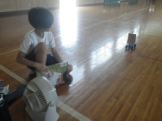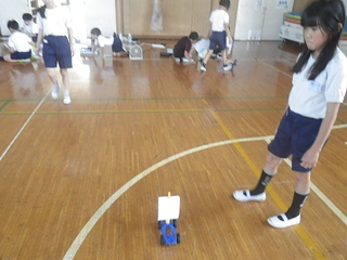 3年生が、理科の学習で風の働きを調べるため、風で動く車をつくって実験をしました。送風機で風を送り、どのようなときに車が動くのか何度も試し、メモを取っていました。