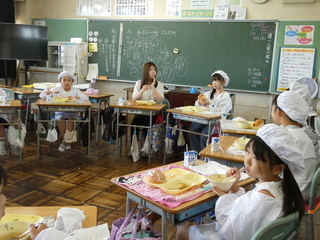 1年生から6年生までのなかよしグループに分かれ、机を円にして並べたり、グループになったりしていつもと違う場所で給食を食べました。このメンバーで遊んだり遠足に行ったりするので、名前を覚えて仲良くしたいです。
