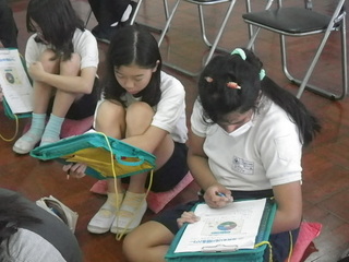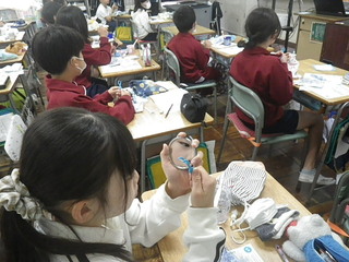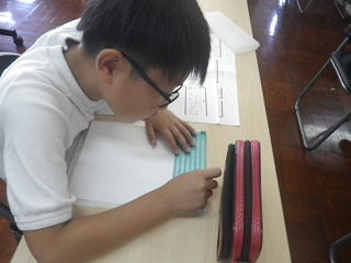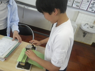 4年生が、講師の方に教えていただきながら点字を打つ体験をしました。子供達は、点字は右から左へ打つ横書きであることを知り、普段の慣れている書き方と違うので大変でした。また、点字タイプライターを見せていただき、簡単に速く文章を書くことができることに驚いていました。