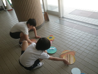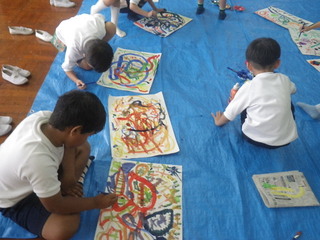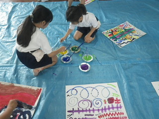 1年生が、共同絵の具を使って、ぐるぐると筆を動かしたり、すーっと引っ張って線を描いたりしました。好きな色を選び、いろいろな形や線を大きな画用紙に伸び伸びと描き、楽しんでいました。