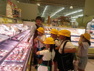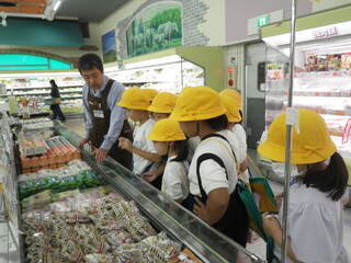 3年生が、近くのスーパーマーケットに行き、仕事している人の工夫や買う人の思いについて考えました。お店の方は、旬のものを目立つようにしたり、品物の種類を多くしたりと買い物がしやすくなるような工夫をしていました。