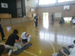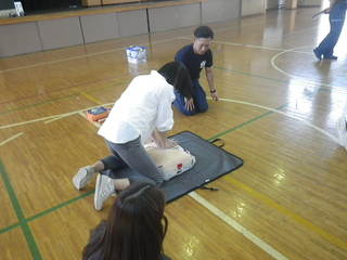 水泳学習を開始するのに合わせ、救命救急士をお招きし、心肺蘇生法やAEDの使い方、エピペンの使用方法など学ぶ救急講習会を実施しました。子供達が毎日の学校生活や体育の学習に安心して取り組めるように、実際のことを想定して研修を行いました。
