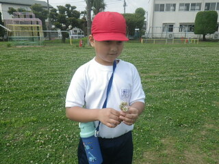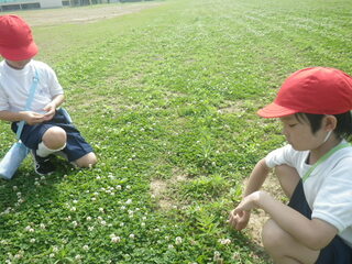 校庭で、季節の植物や虫を探したり観察したりしました。見つけた草花を利用して遊びをしました。シロツメクサでは、花かんむりや指輪をつくったり、オオバコ相撲をしたりしました。
