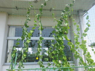 暑い日差しにも負けず、琉球朝顔によるグリーンカーテンがぐんぐん育ってきました。琉球朝顔は、花が3つ以上集まって咲いています。しかし、種はできません。1年生の皆さんの朝顔は、どれくらい成長したでしょうか。4年生が植えたヘチマもつるを伸ばしています。