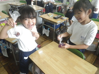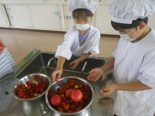 2年生は、ミニトマトを育てています。ミニトマトの苗の背丈は、自分の身長に近づいてきました。真っ赤なミニトマトが次々と実り始め、今日は、ミニトマトを収穫しました。夏休み中も、持ち帰って育てます。