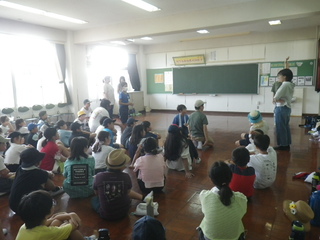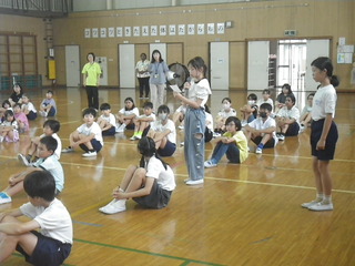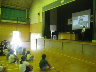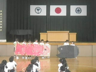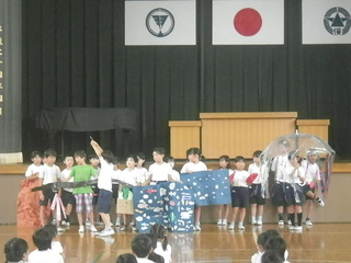 2年生が、国語の時間に学んだスイミーの音読を披露しました。スイミーが海の底を冒険する様子を動作をつけながら、音読しました。2年生がつくったクラゲやイソギンチャクなどが泳いでいて、まるで、体育館が海の中のようでした。