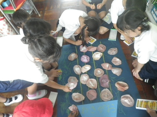 3年生が、羽生市民プラザにてハンカチの藍染め体験を行いました。講師の方には、藍染の材料の葉を見せてもらい、藍染の染料は、生きものなので大切に扱うように教えていただきました。どのような藍色のハンカチができるのか楽しみです。