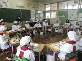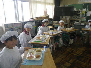 1~6年生の縦割り班に分かれて給食を食べました。給食のメニューについて話したり、なかよしハイキングについて話したりしました。もりもり食べている6年生の姿を見ると、食も進みます。残さず食べることができました。