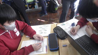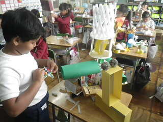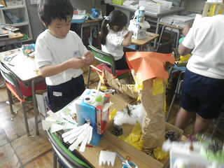 1年生が、いろいろな紙箱を組み合わせて、思い思いに生き物などをつくっています。子供達は、紙箱の接着の仕方を工夫し、動くようにしたり音が出るようにしたりしていました。どのような生き物が生まれるのか楽しみです。