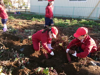 地域の方にご協力いただき、育ててきたさつまいもをいよいよ収穫します。1・2年生はせっせと土を掘り起こし、つるに何個もついたさつまいもや大きなさつまいもを掘りました。掘っても掘ってもどんどん出てくるさつまいもにうれしい悲鳴があがっていました。
