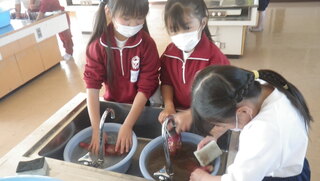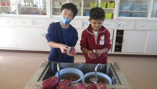 1・2年生が、せっせと掘ったさつまいもを今度は洗います。ふれあいまつりで焼き芋をするため、全校児童分を洗いました。自分の顔と同じ大きさのさつまいもはどっしりとして重いです。どんな味なのか楽しみです。