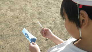 3年生が、虫眼鏡で集めた日光があたったところの明るさやあたたかさを調べました。虫眼鏡で日光を集め、集めたところをさらに小さくすると、光が強くなり、熱くなって黒い紙が焦げるくらいになりました。