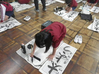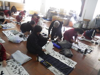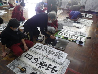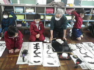 5・6年生が、地域の書家をお招きし書きぞめを練習しました。5・6年生は、漢字と平仮名が混じった課題なので、とても難しいです。左はらいを書くときの筆の運びを教えていただきました。教えていただいたことを、家でも練習したいですと感想を伝えている児童もいました。
