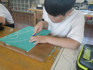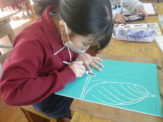 4年生が、初めて彫刻刀を使い、版木を掘りました。彫刻刀の種類によって、彫った感じが少し違うことに気付くと、自分はどのように表したいか考えて彫刻刀を選びました。みんな集中して取り組んでいます。